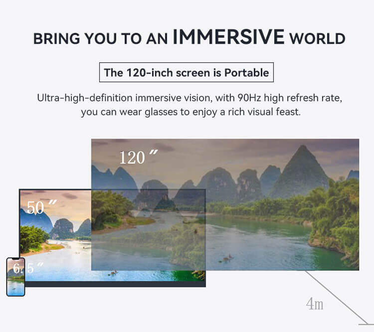 The 120-inch screen is Portable.Ultra-high-definition immersive vision, with 90Hz high refresh rate, you can wear glasses to enjoy a rich visual feast.