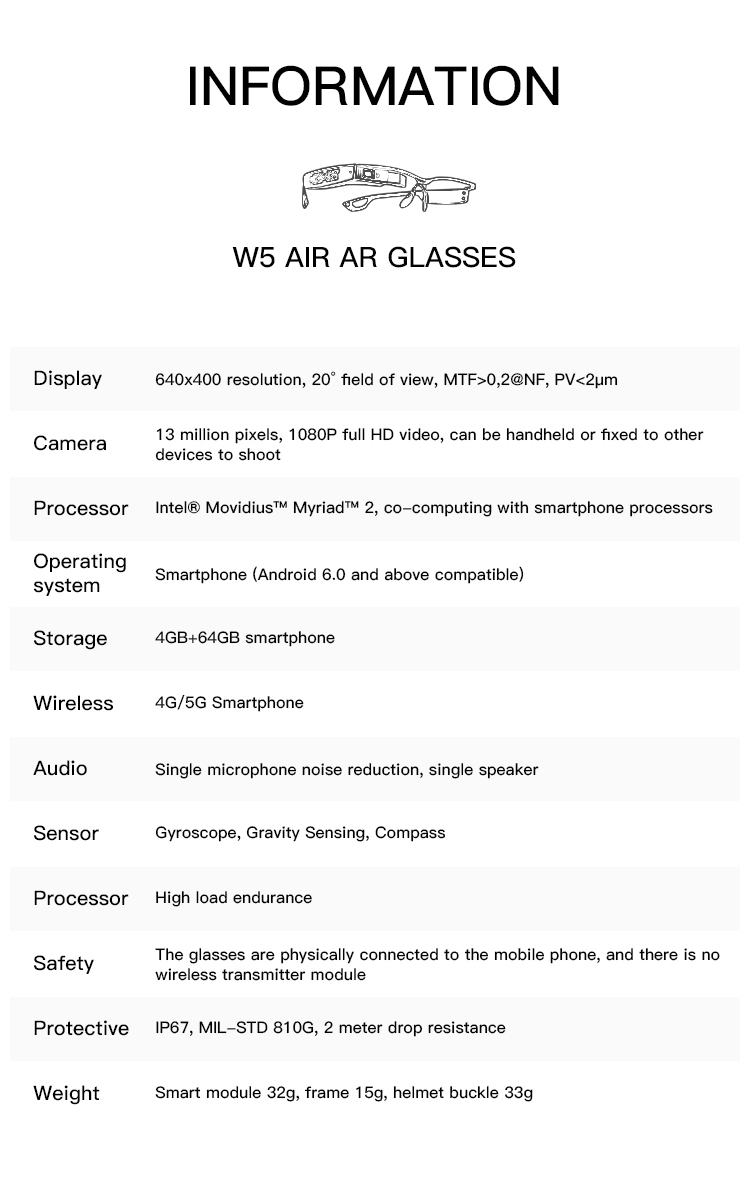 W5 시리얼은 근안 디스플레이 기술을 기반으로 한 스마트 안경입니다. 작업을 위해서는 스마트폰과 유선으로 연결되어 있어야 합니다. 다양한 플랫폼을 위한 앱이 있습니다. 카메라와 디스플레이, 마이크, 스피커가 있습니다. 산업용 및 상업용 스마트 안경용으로 설계되어 .